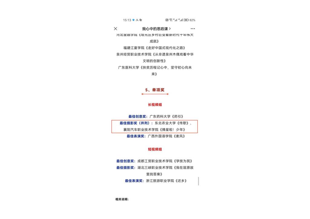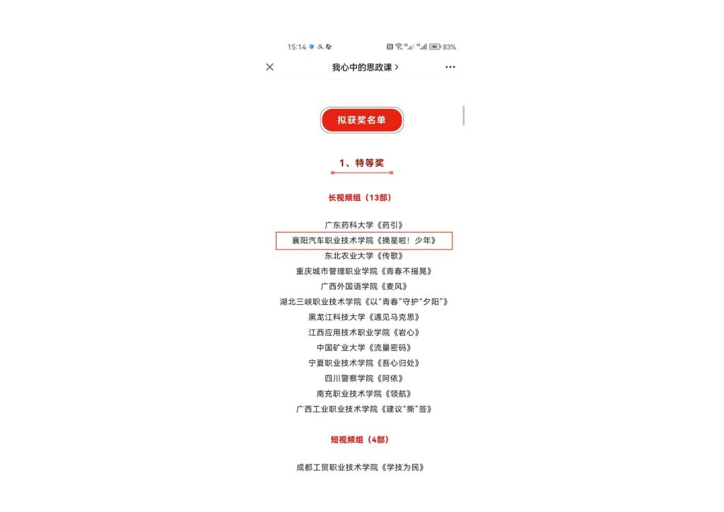 《摘星啦,少年》荣获特等奖,充分展示了我校思政课教学的良好成效,学校将继续加强思政课教学模式探索与改革,在改进中加强、在创新中提高,不断提升高校思想政治教育实效性,引导学生坚定理想信念,培养德智体美全面发展的社会主义建设者和接班人。
