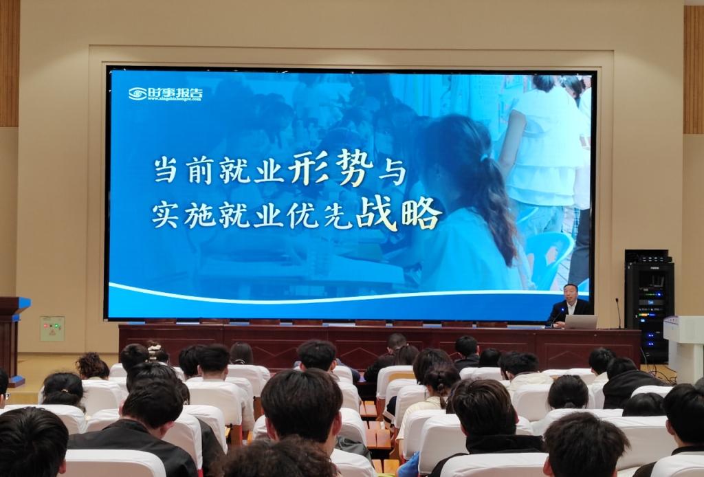 余荣宝聚焦襄阳都市圈高质量发展建设,从我国就业稳定发展的形势、就业面临的压力、推动我国就业发展的重要举措等方面为学生做了深入浅出的讲解。讲座中,余荣宝结合襄阳市情、学校校情以及学生学情,精准解读了襄阳出台的“1+7”人才政策,诠释了“以汽车之名 服务汽车之城”的育人理念,鼓励并引导学生实现本地就业。余荣宝强调,要以学生就业服务攻坚行动为抓手,以多措并举助力毕业生好就业、就好业,打好全力促进就业的“组合拳”,以高质量人才赋能襄阳都市圈高质量发展。
