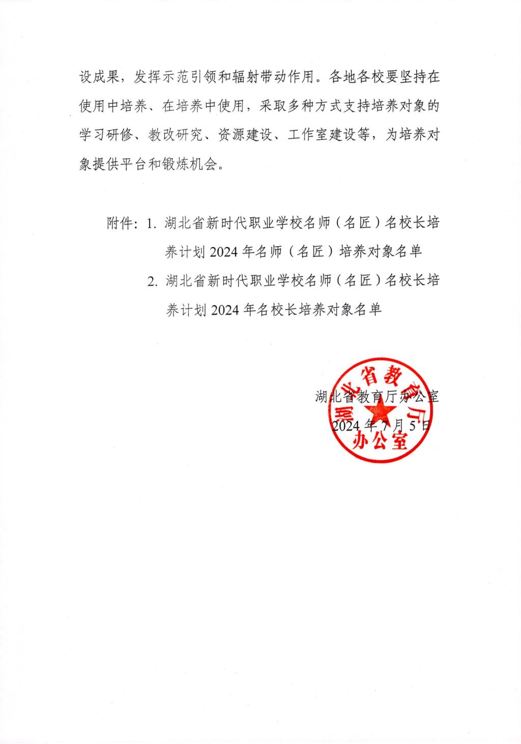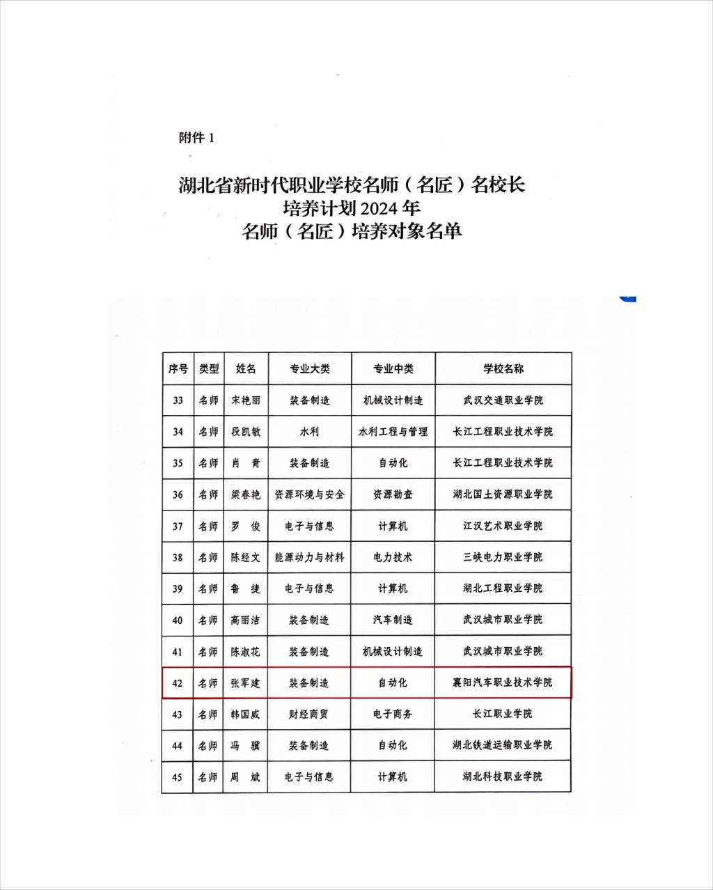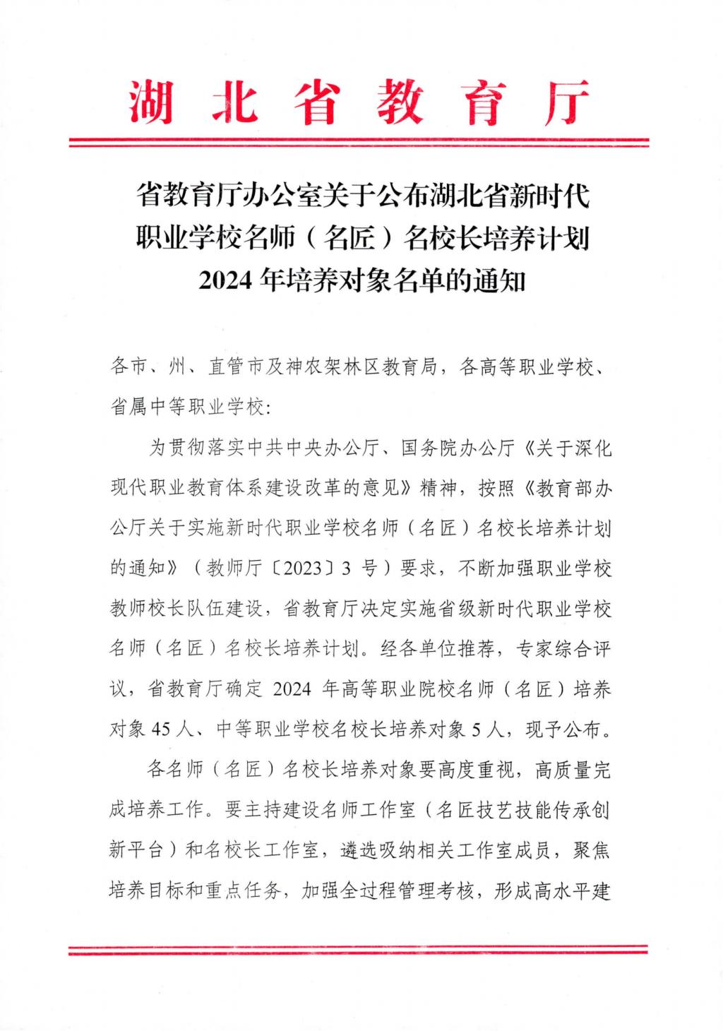 为不断加强职业学校教师校长队伍建设,全面落实《关于深化现代职业教育体系建设改革的意见》文件精神,根据《教育部办公厅关于实施新时代职业学校名师(名匠)名校长培养计划的通知》(教师厅〔2023〕3号)要求,省教育厅决定实施省级新时代职业学校名师(名匠)名校长培养计划。经单位推荐、专家综合评议等,确定45人为高等职业院校名师(名匠)培养对象。