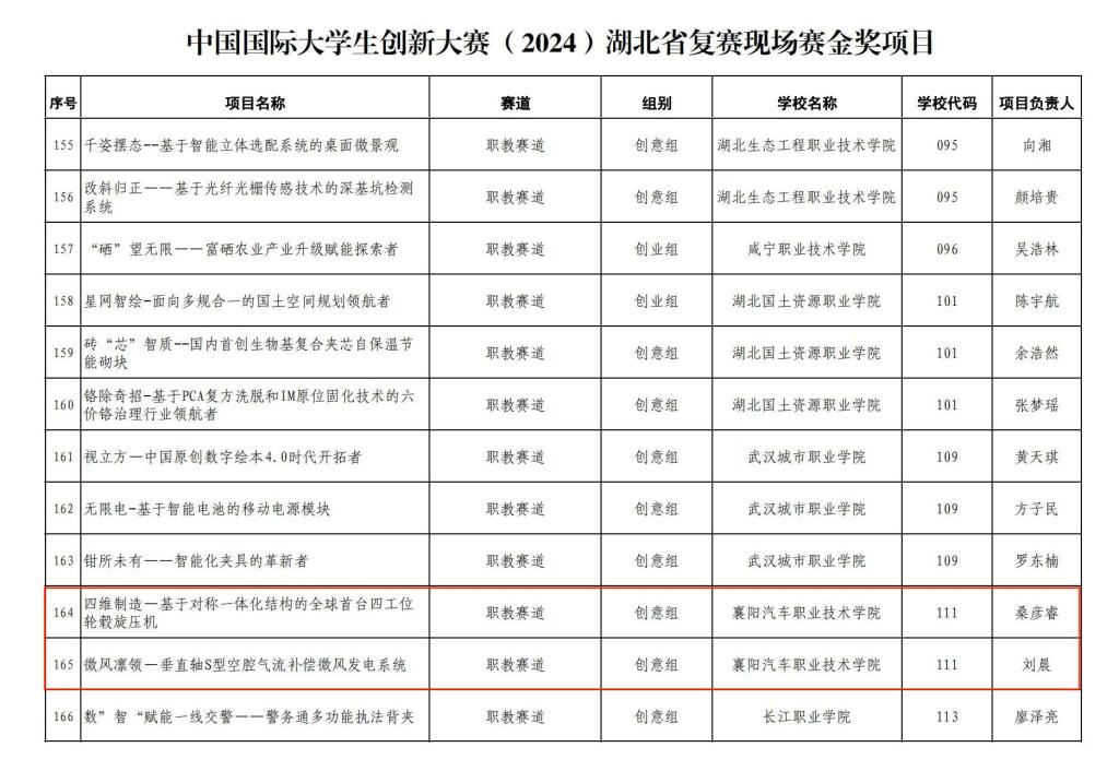 其中交通运输学院/现代管理学院《四维制造—基于对称一体化结构的首台四工位轮毂旋压机》项目在30日职教赛道金奖排位赛(含创业组、创意组)中荣获第5名(创意组第一名)、智能制造学院《微风凛领—垂直轴S型空腔气流补偿微风发电系统》项目荣获第19名!实现我校中国国际大学生创新大赛这一国内最大综合性赛事成绩历史性突破!