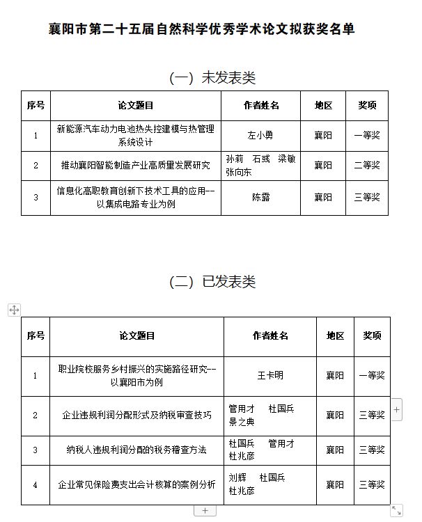近日,襄阳市科学技术学会公布了第二十五届自然科学优秀学术论文评选结果,我校教师共7篇论文获得奖项,其中一等奖2项,二等奖1项,三等奖4项。