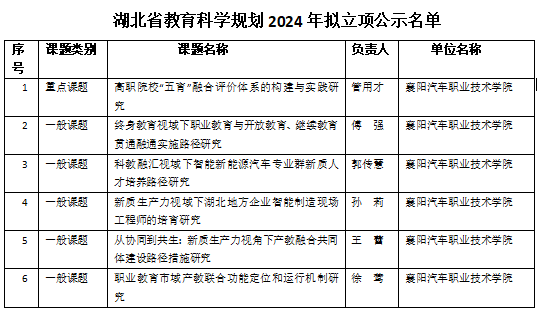 近日,湖北省教育科学规划领导小组办公室公布了湖北省教育科学规划2024年度拟立项课题公示名单,我校共6项课题获批立项,其中,重点课题1项,一般课题5项。