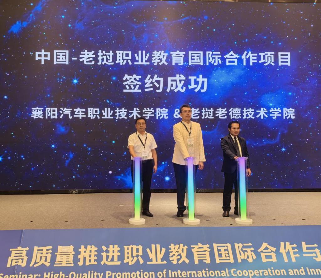 会上我校作为中方发起院校之一的中国—老挝国际产教融合发展联盟宣布成立。在老挝教育体育部副部长苏里乌冬·孙达拉见证下,程传红代表学校与老挝老德技术学院签订国际合作项目协议,老挝教育体育部技术与职业教育司授予我校“老挝职业标准开发突出建设单位”。