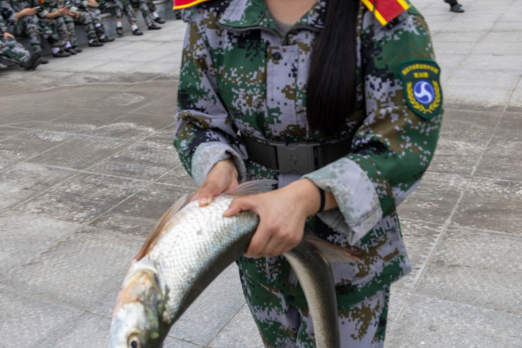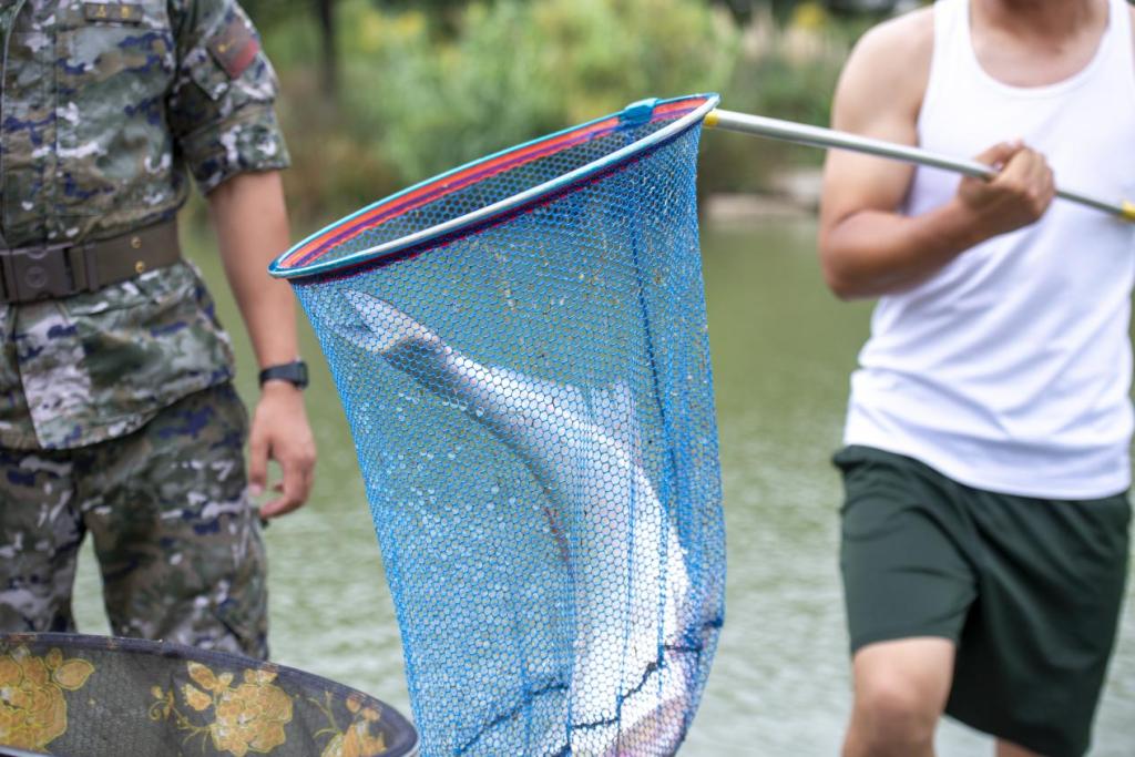 教官与同学们的激情,大家纷纷加入捕鱼行列。有的女生大胆拿起抄网,瞅准时机,当机立断网起一条白鲶鱼,周边围观的人群发出激烈的欢呼声;有的男生跃跃欲试,卷起裤腿在湖边的浅水区开启“徒手抓鱼”模式,大家纷纷被此刻的欢快氛围感染,湖边飘荡着阵阵欢声笑语。就连平时训练中严肃的教官们也加入了捕鱼的阵营,他们中有人只着短袖衣裤,正准备下水“大显身手”;也有的教官是“旱鸭子”,干脆拿起抄网,豁出去大干一场。
