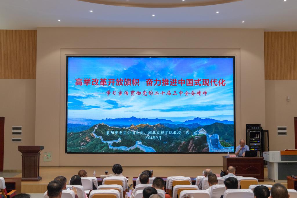 襄阳市委宣讲团成员、湖北文理学院教授徐超做了“高举改革开放旗帜,奋力推进中国式现代化”的专题报告,重点结合深化商会的经济改革与发展需求,解读了二十届三中全会精神。