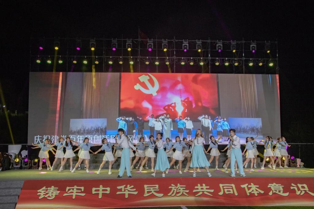 晚会以开场鼓舞表演《鼓舞盛世》拉开序幕。随后,唱跳歌曲《大梦想家》燃爆全场,大展青年学子们的蓬勃朝气;师生合唱曲目《是老师是学生》展现了在襄汽校园师生之间的温暖情谊;情景剧《我与大艺展》再现了我校作为全国第七届大学生艺术展演诗歌、朗诵场馆以及大艺展志愿服务的故事;由我校社区教育指导中心的老年学员们带来的《天山牧歌》和学校青年学子们共同呈现的《民族印象》舞蹈展现了我校多元的文化氛围,共同用舞蹈讲述着全国各民族团结一家亲的美好画面,用舞蹈表达了铸牢中华民族共同体意识;由各学院党总支书记带来的朗诵《盛世中国》,让现场所有的师生共同感受祖国的繁荣昌盛,激励广大青年学子将个人理想融入国家发展。最后,晚会在万名师生齐声高唱《我爱你祖国》中圆满落下帷幕,共同庆祝中华人民共和国成立75周年。