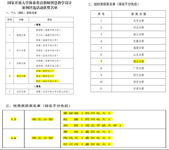 近日,国家开放大学体系英语智慧教学设计案例评选活动圆满收官。经过与来自全国兄弟院校数百名教师的激烈角逐,我校陶金、彭梅老师喜获一等奖,黄琳、陶纯芝、但汉玲老师喜获优秀奖。