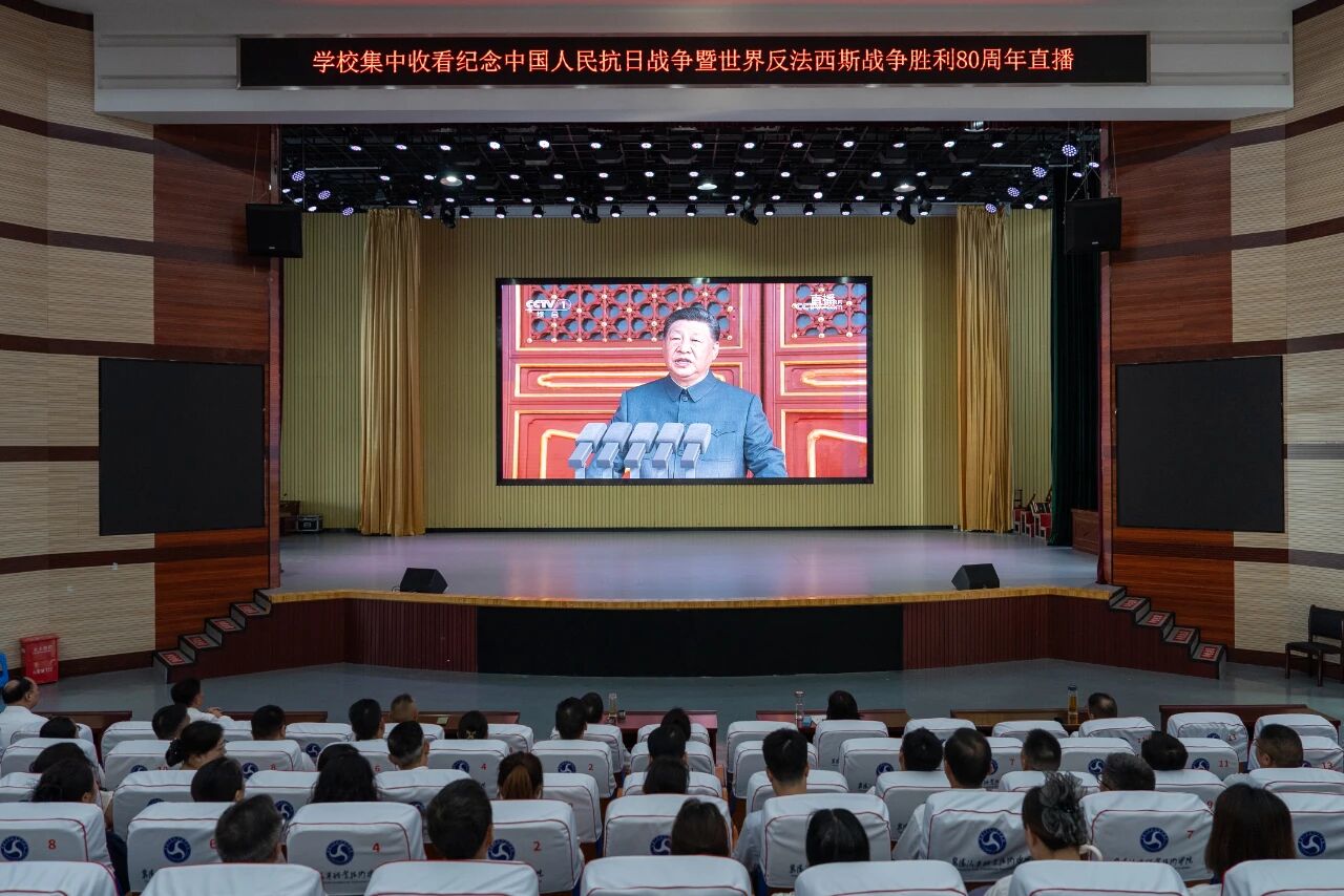 9月3日,纪念中国人民抗日战争暨世界反法西斯战争胜利80周年大会在北京天安门广场隆重举行。上午9时,学校党委书记程传红及领导班子成员率全校教职工在科学会堂集中观看,各院部学生通过多种形式集中收看直播,共同上了一堂生动的爱国主义教育和国防教育课。