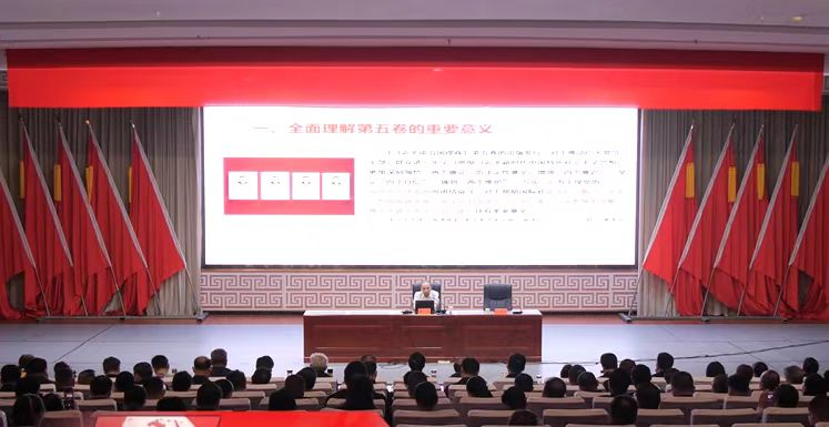 傅强围绕“学好用好《习近平谈治国理政》第五卷”这一核心主题,立足马克思主义中国化时代化的理论高度,从提高认识,深刻领会重大意义,学懂弄通,准确把握核心要义,学思践悟,确保学习走深走实三个关键维度进行了系统阐述和深刻讲解。报告不仅深入解读了著作的历史逻辑、现实背景、未来意义,以及其中蕴含的新理念新思想新战略,更紧密结合谷城县乃至襄阳市发展的实际状况,将宏大的理论体系与具体的市县发展蓝图有机融合。傅强引导与会者深刻领悟著作的精神实质、核心要义和实践要求,强调要坚持学思用贯通、知信行统一,切实把学习成果转化为推动市县高质量发展的强大动力和工作实效,为开创地方发展新局面提供坚实的理论支撑和思想引领。整场宣讲主题鲜明、内涵丰富、逻辑严密、联系实际,具有很强的思想性、指导性和针对性,对与会干部进一步统一思想、深化认识、推动工作具有重要的指导意义。