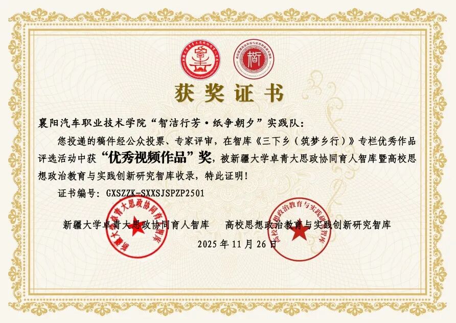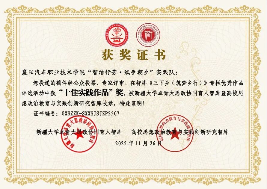 近日,襄阳汽车职业技术学院“智洁行芳 纸争朝夕”实践队喜获佳绩,其社会实践作品成功收录于新疆大学卓青大思政协同育人智库、高校思想政治教育与实践创新研究智库两大专业平台,并荣获“优秀视频作品”“十佳实践作品”两项奖励,充分彰显了学校实践育人与思政教育融合的丰硕成果。