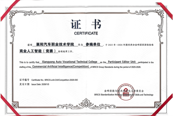 近日,襄阳汽车职业技术学院荣获金砖技能与技术标准化工作委员会颁发的证书,正式成为金砖国家团体标准《商业人工智能(竞赛)》的参编单位。此举标志着学校在人工智能领域深度参与国际标准制定,迈出了具有里程碑意义的重要一步。