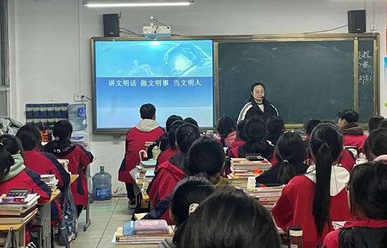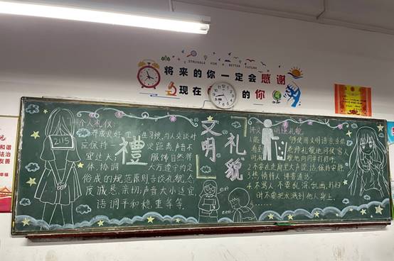 各班利用班会对学生集中开展了“讲文明话,行文明事,做文明人”专题教育;通过横幅、电子屏、黑板报,学习文明礼仪,加强氛围营造,推动文明礼仪规范转化为个人文明习惯的具体实践。