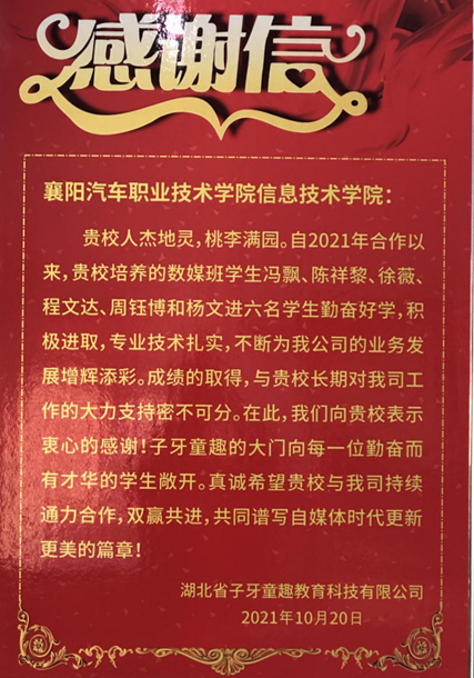 10月25日下午,湖北省子牙童趣教育科技有限公司人事经理宋亚莉一行到校回访,信息技术学院2019级数字媒体技术专业优秀实习生冯飘陪同,并向学院送上感谢信和锦旗,感谢信息技术学院对学生的精心指导和培育,输送的学生爱岗敬业,业务精湛,不仅满足了企业发展的人才需求,同时为企业的快速发展做出了突出贡献,特向学校表示感谢。