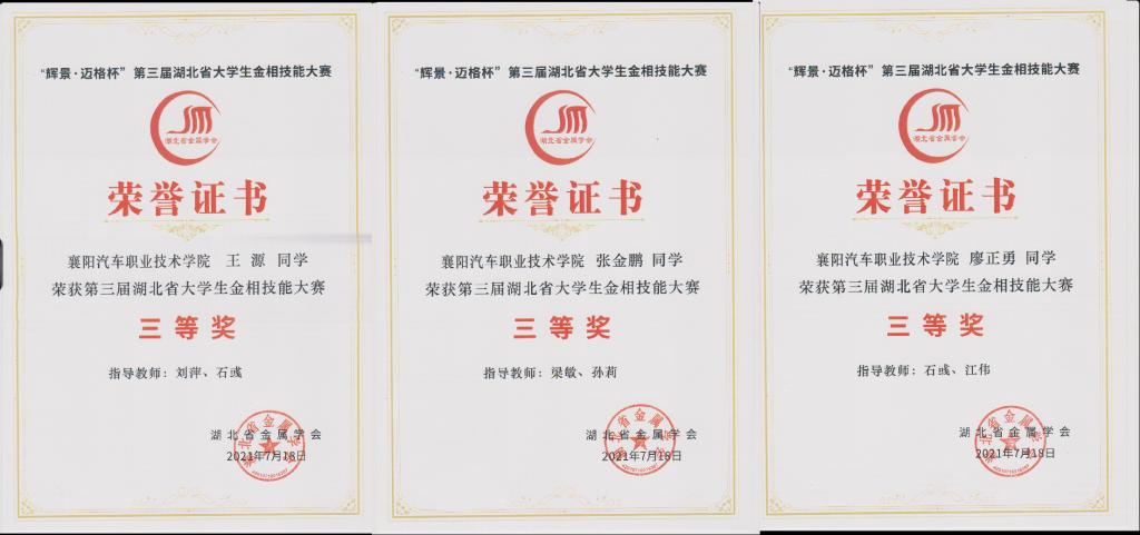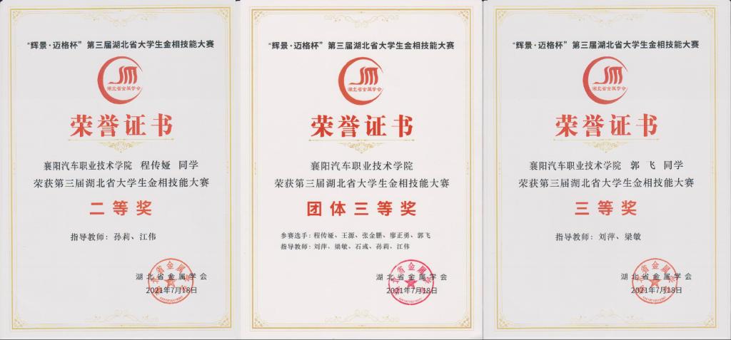 7月18日,“辉景.迈格杯”第三届湖北省大学生金相技能大赛在武汉理工大学胜利闭幕,全省29所高校代表队参与大赛,共有140名学生参赛。我校智能制造学院5名学生在刘萍、梁敏、石彧等专业老师的指导下参赛,全部获奖,其中程传娅同学凭借扎实的专业知识和稳定的发挥获得个人二等奖。