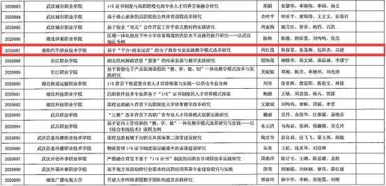 2021年5月27日,湖北省教育厅公布了2020年度“湖北省高等学校省级教学研究项目”名单,此次共通过899个项目,我院教学副院长何红霞作为课题主持人的《基于“平台+商业运营”的电子商务专业实践教学模式改革研究》课题在列,项目主要参与人有耿保荃、张显辉、包科杰、高捷,该课题是我校此次唯一立项成功项目,在此向项目团队表示热烈祝贺!