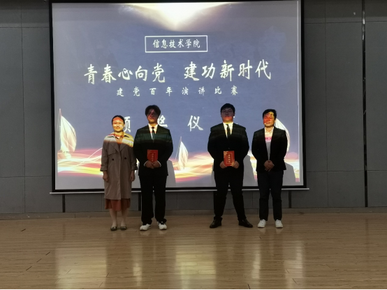 为庆祝中国共产党建党百年华诞,重温党的光辉历程,歌颂党的伟大成就,继承和发扬党的优良革命传统,充分展示当代大学生的爱党爱国爱社会主义的深厚情怀,向党的100岁华诞献礼,信息技术学院于5月25日在一号楼报告厅举办了“青春心向党,建功新时代”为主题的演讲比赛。