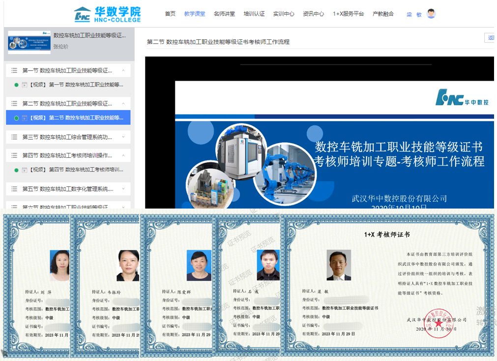 8月底,机制专业数控车铣教学团队前往第三方培训评价企业——华中数控股份有限公司培训,7人取得了“1+X数控车铣加工职业技能等级证书(中级)”培训讲师证书。