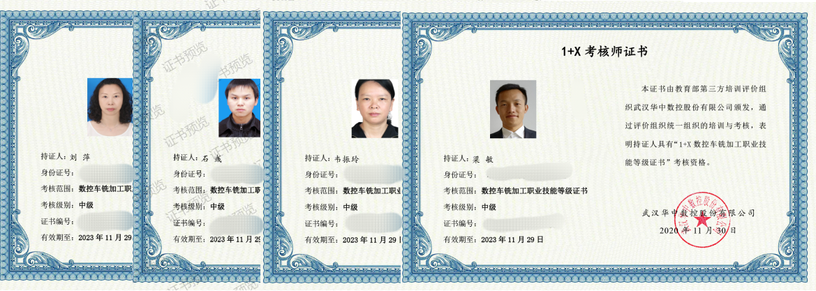 11月底,机制专业负责人梁敏主任牵头组织刘萍、韦振玲、陈爱群、石彧等专业教师参加1+X 数控车铣考核师培训,均获得“1+X数控车铣加工职业技能等级证书”考核师证书。目前机制专业数控教学团队已经同时具备了“1+X数控车铣职业技能等级证书(中级)”培训和考核资格。