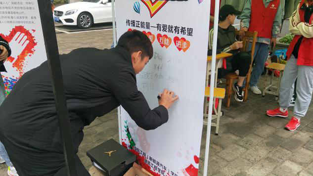 活动期间,虽然遇上了阴雨天气,但也阻挡不了大家的爱心,活动刚刚开始就有许多热心的同学前来咨询和捐赠,志愿者们积极配合、干劲十足,耐心地向同学们介绍举办此次活动的过程和意义,捐赠者并在海报上签名留念。