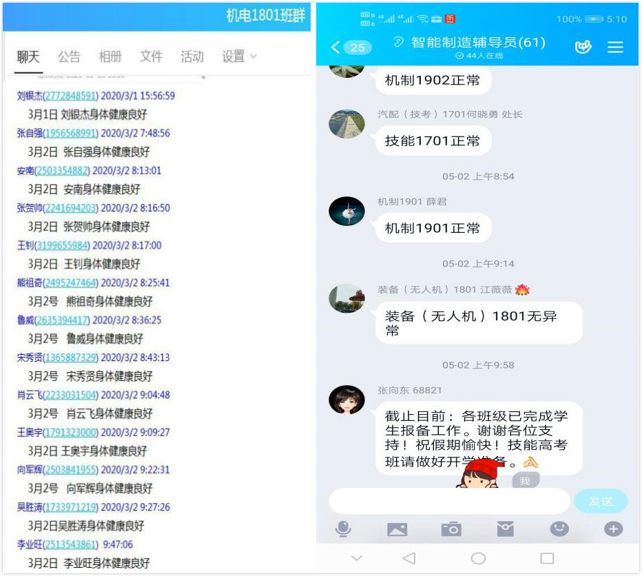 面对突发的疫情,我院全体班主任第一时间响应学校号召,寒假期间“回归”工作岗位,建立长效,全方位的信息渠道,通过班级QQ群、微信和电话等方式做好学生健康数据摸排。采取每个学生每日上报班主任,班主任每日上报学院,学院每日上报学校的方法,确保及时准确了解每个学生的信息。学院领导每日电话抽查五名学生,及时做好学生的跟踪服务。