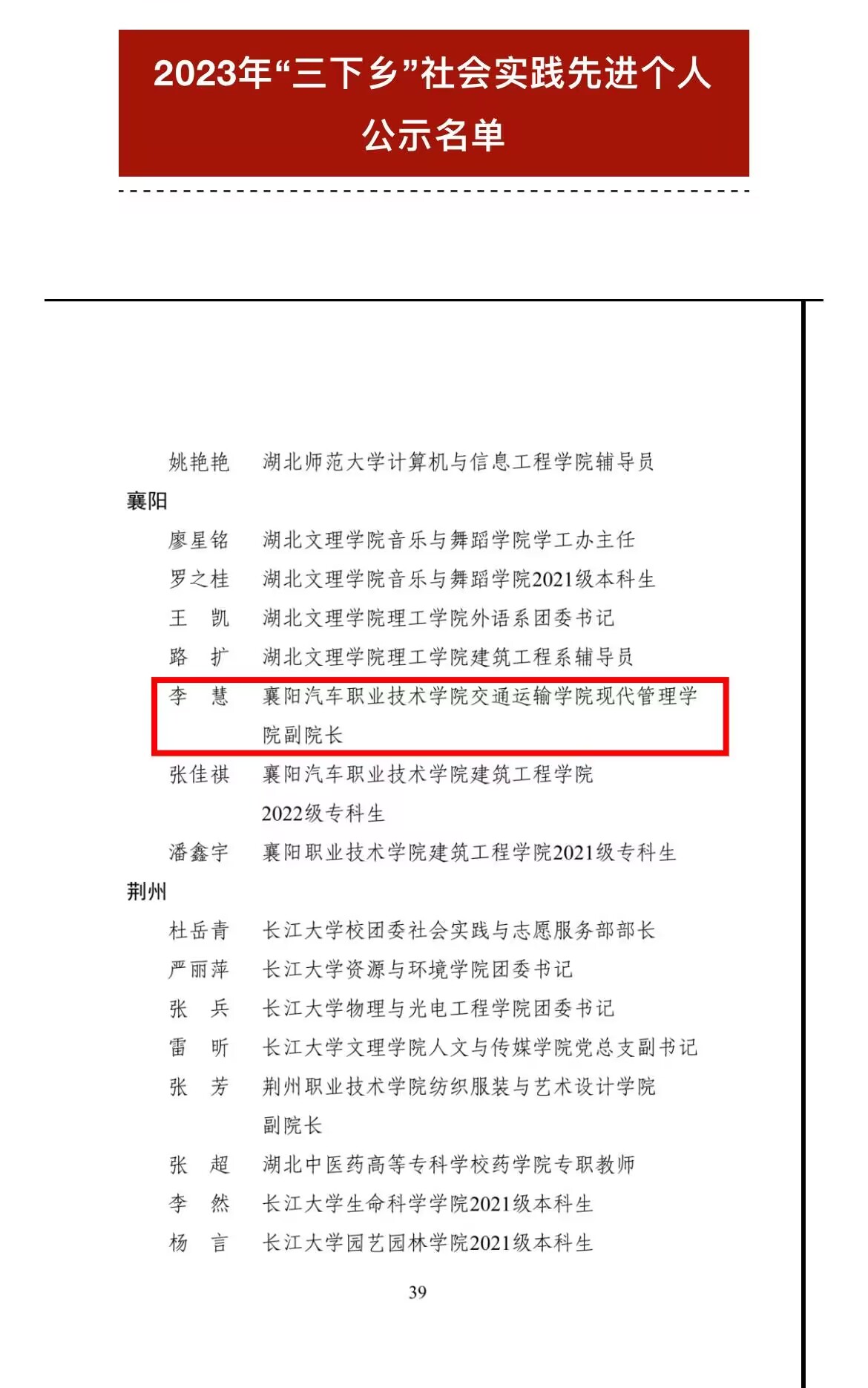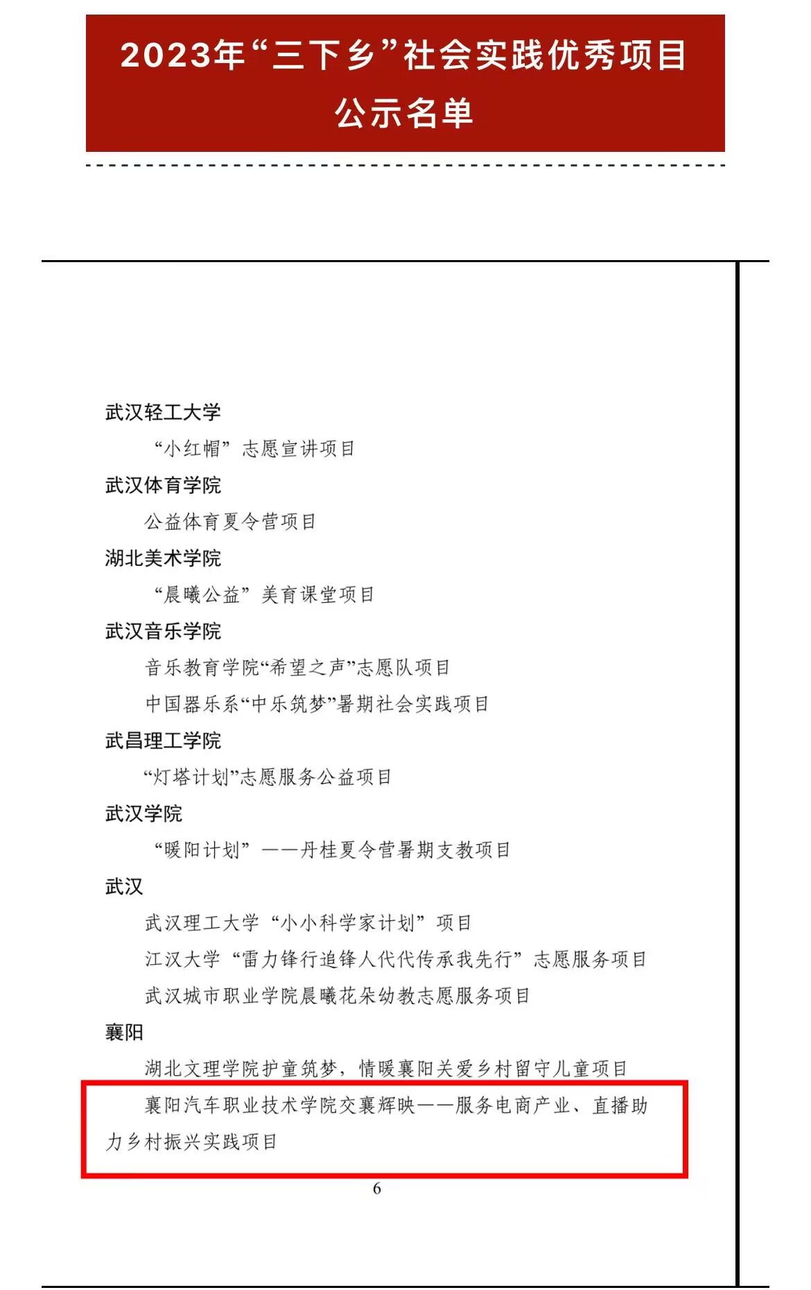 为充分展示2023年全国大中专学生志愿者暑期“三下乡”社会实践活动成果,共青团中央青年发展部、中国青年报、中国青年网共同举办了2023年全国大中专学生志愿者暑期文化科技卫生“三下乡”社会实践“镜头中的三下乡”征集活动。我校“乡情襄爱.交襄辉映--直播助力乡村振兴”团队荣获全国优秀视频团队称号。同时,“交襄辉映--服务电商产业、直播助力乡村振兴”实践项目被共青团湖北省委评选为2023年“三下乡”社会实践优秀项目,团队指导教师李慧被评选为省级“三下乡”优秀个人。