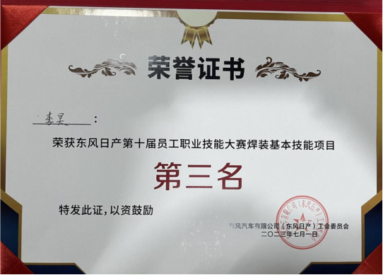 东风日产第十届员工职业技能大赛焊装基本项目第三名