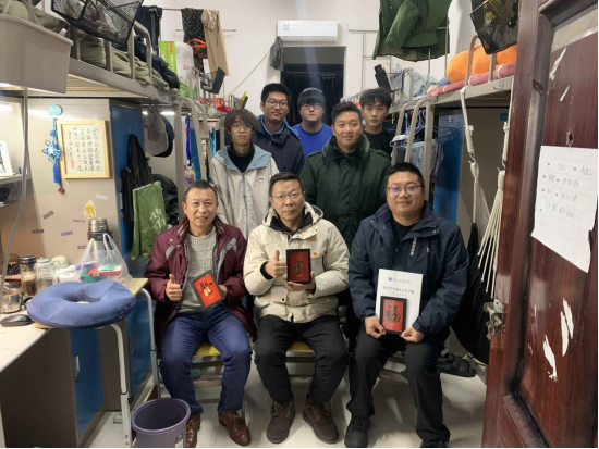 他仔细查看了同学们的寝室环境,关心了解同学们的学业规划和生活情况,听取大家对学校发展的建议,寒假出行安排等,并送上新年祝福。他围绕家乡特色、学校生活、期末考试与就业实习等同学们关注关心的话题,分享自己的经验感悟,亲切与之对话交流,耐心解答了同学们提出的问题。他表示,学院会密切关心关爱学生,切实为学生办实事,解难题,不断提高服务质量和水平,从而为大家的学习和生活保驾护航。同时,他勉励同学们在新的一年里设定目标,珍惜韶光,勤勉奋斗,不负青春。室外温度接近零下,而暖意融融的宿舍内传出阵阵欢声笑语。倪高垚同学还为老师们送上专业知识绘制、亲手制作的工艺摆件,表达龙年新春佳节美好祝福。