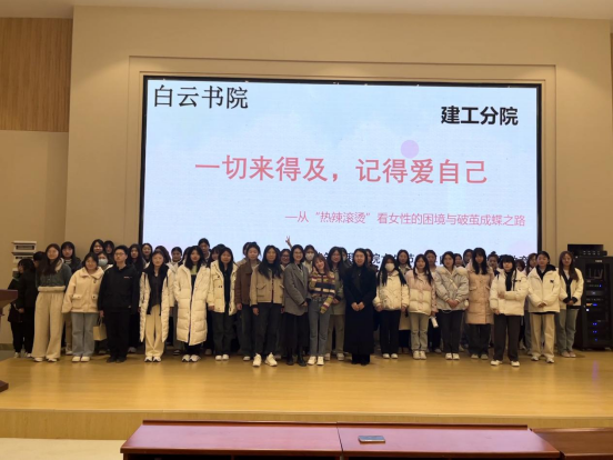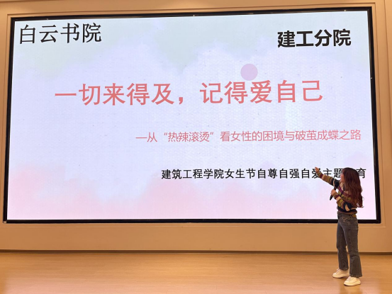 讲座开始前,建筑工程学院的女生们收到了来自学院男生们的视频祝福。讲座以视频和案例相结合方式,讲解了女性在成长过程中的机遇与挑战。同时以《热辣滚烫》主人翁的经历抛砖引玉,让在场同学们自发的分享个人成长的经历。彭老师也为现场的女生在成长过程中如何自尊自强自爱指明了方向。