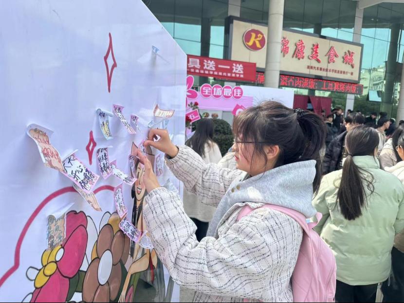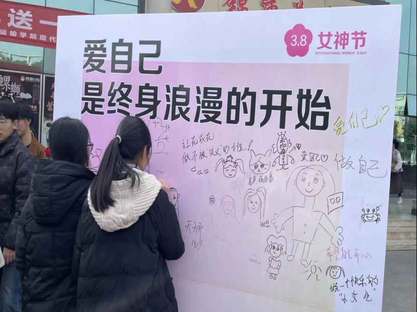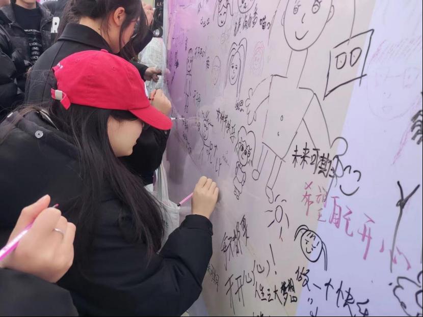 活动现场温馨浪漫,五彩斑斓的气球、鲜艳的花朵、精美的展板,无不洋溢着节日的氛围。女性师生们有序地在展板上贴上自己的期望话语和对家人朋友的祝福。每一张便签都充满了温度和情感,字里行间流露出女性特有的细腻和温柔。