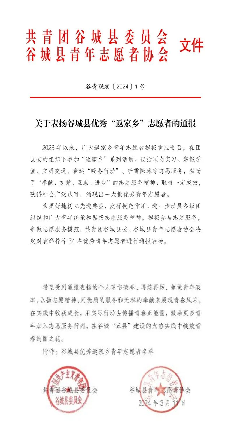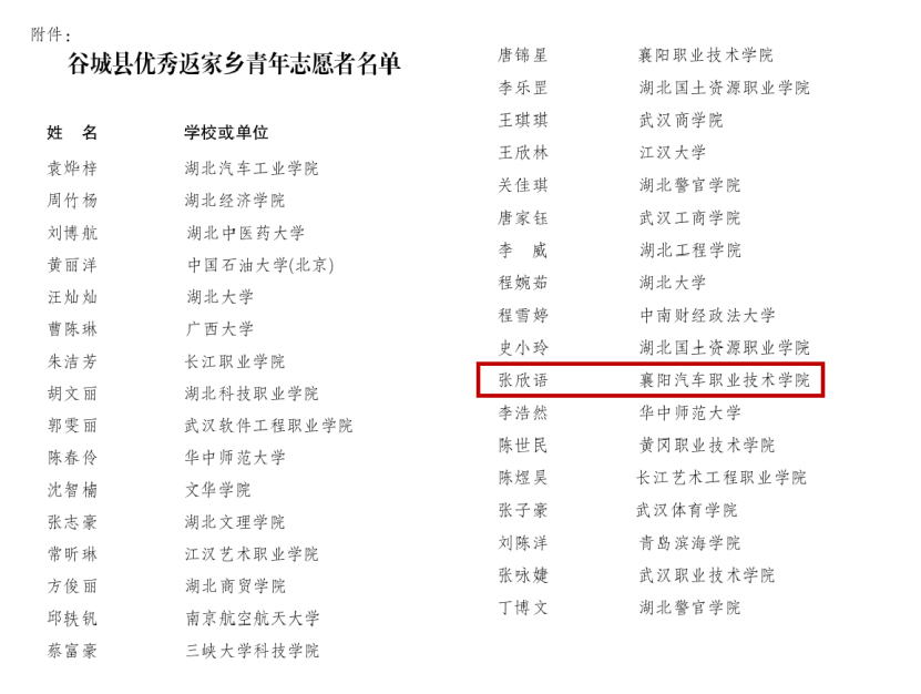 近日,共青团谷城县委员会和谷城县青年志愿者协会关于表扬谷城县优秀“返家乡”志愿者的名单公布,我院张欣语同学荣获谷城县优秀“返家乡”志愿者。