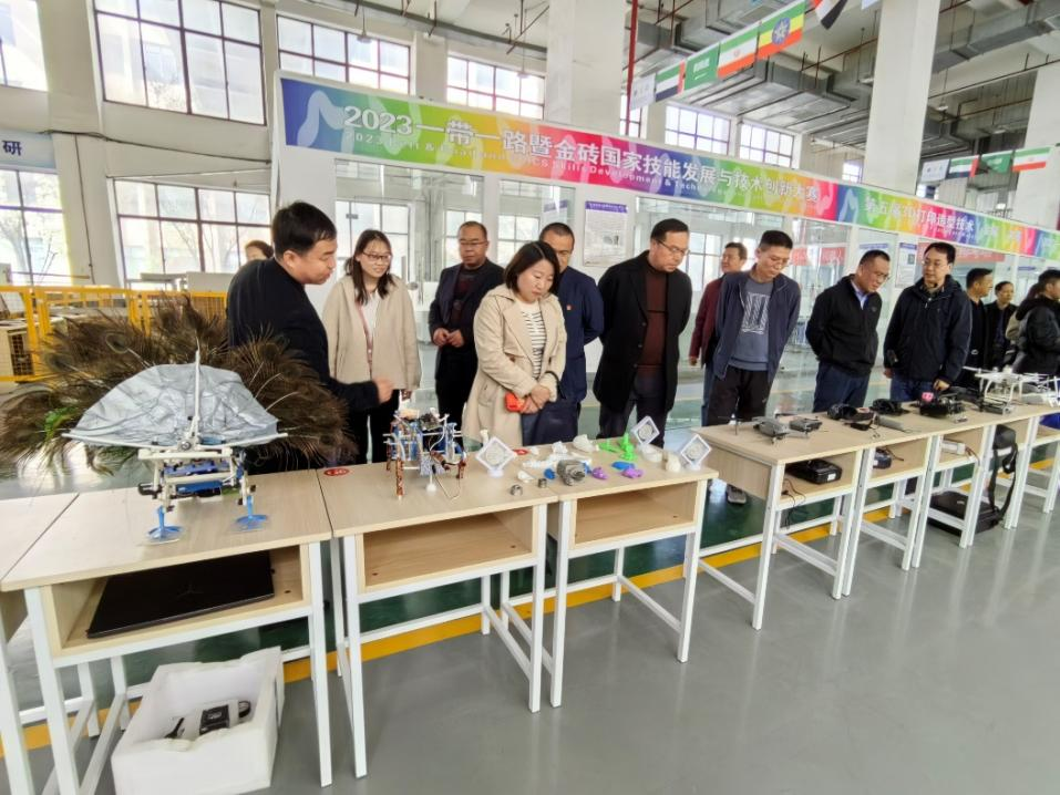 嘉宾先后参观了学校车队馆、智能制造工程训练中心(襄阳市科普教育基地)。智能制造学院副院长马春亮详细介绍了工训中心“一心五平台”的架构设计,以及紧跟产业转型升级中岗位核心能力的需求设置的实训单元——工业机器人、智能制造产线、数字孪生和数控加工训练区,该区域主要承担着实训教学、1+X考证、企业员工培训、退役士兵培训和中小学科普教育等多种任务。