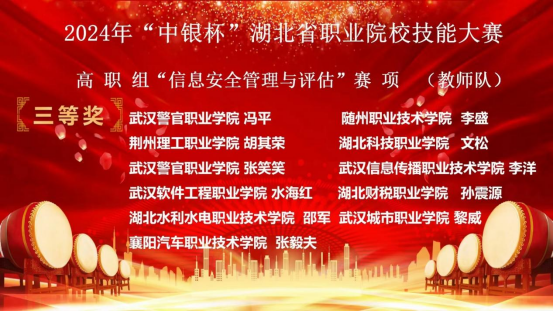 3月23日,2024年“中银杯”湖北省职业院校技能大赛(高职组)信息安全管理与评估赛项在湖北生物科技职业学院圆满闭赛。本次大赛由来自全省42所高职院校积极参与,共计84支学生参赛队、252名参赛选手、73名参赛指导教师齐聚一堂、共同竞技。信息安全技术应用专业教师张毅夫首次作为指导老师参赛,荣获教师组三等奖。
