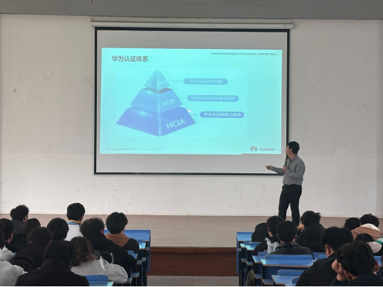 3月27日,华为ICT学院校园行活动在我校信息技术学院报告厅举行,华为金牌HALP — 武汉誉天互联科技有限公司校企合作总监袁圆应邀出席此次活动,会议由学校华为ICT学院负责人徐强主持,软件技术专业研究室主任李腾飞、现代移动通信技术专业研究室主任李雄锋,以及相关专业200余名学生参加。