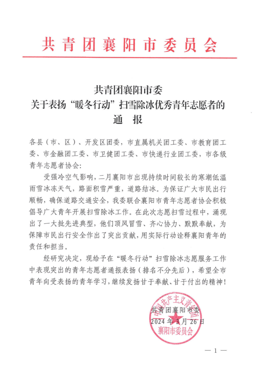 近日,共青团襄阳市委表扬了一批在“暖冬行动”中扫雪除冰的优秀青年志愿者,我院张欣语同学荣获表彰。