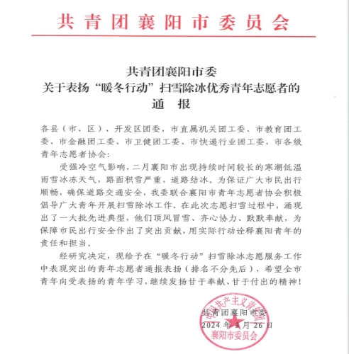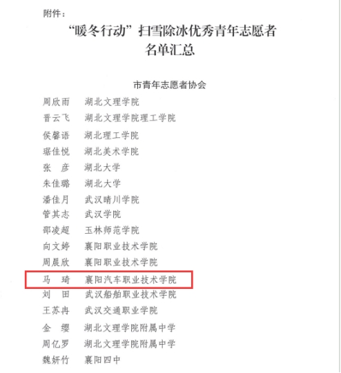 近日,共青团襄阳市委表扬了一批在“暖冬行动”中扫雪除冰的优秀青年志愿者,我院计算机(3+2)2103班马琦同学荣获表彰。