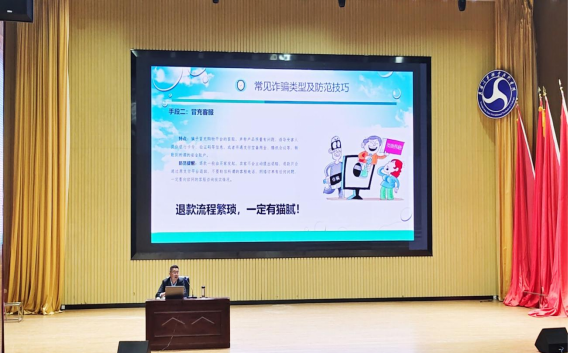 讲座内容包含如何识别、防范电信诈骗,如何保护人身安全、财产安全,规避宿舍火灾等。叶俊华首先列举了发生在同学们身边的真实案例,通过这些案例,使同学们认识到电信诈骗无处不在,防范诈骗人人有责。而后讲解遇到校园霸凌,敲诈勒索等恶性事件该如何自我保护,维护自身权益。最后强调宿舍禁止使用大功率电器,务必加强防范宿舍火灾的发生。