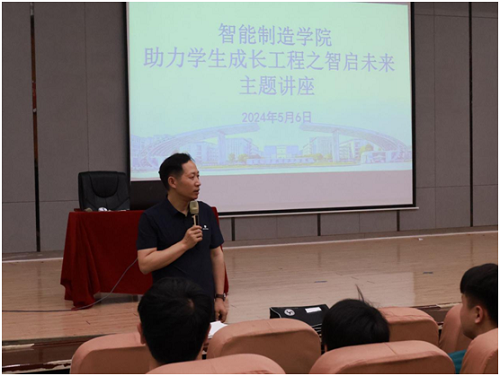 耕耘更知韶光贵,不待扬鞭自奋蹄。为加强学生职业生涯规划的指导,帮助学生正确评估自己,挖掘自身潜能,落实助力学生成长工程,5月6日下午,智能制造学院在一号教学楼学术报告厅开展“助力学生成长工程之智启未来”主题讲座,本次讲座由智能制造学院党总支书记张军建主持,优秀毕业学生党兴佩主讲,参与讲座的有辅导员徐杨、各班班班干部和优秀学生代表。