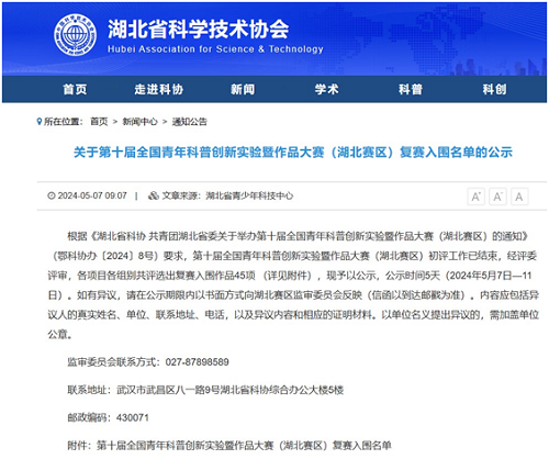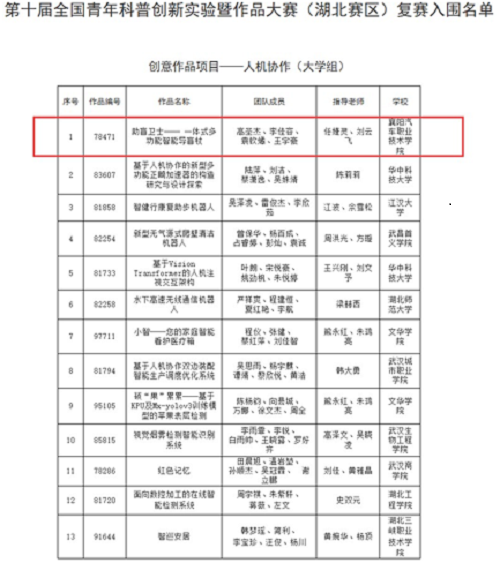 近日,由湖北省科学技术协会、共青团湖北省委共同主办的第十届全国青年科普创新实验暨作品大赛湖北赛区复赛入围名单公布,我校智能制造学院任婕灵,刘云飞老师指导的“助盲卫士──一体式多功能智能导盲杖”项目成功入围复赛,位列大学组第一。