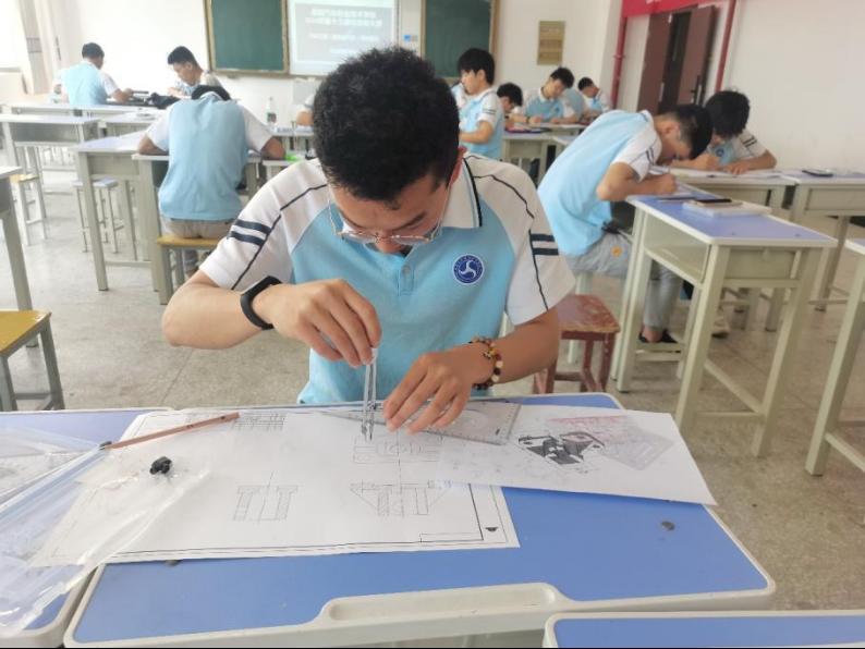 在比赛中,参赛选手们态度认真,充分利用平时的所学技能,娴熟地画出规定图形,争分夺秒,熟练敏捷,专注的绘制着零件线条,历经两个小时紧张激烈的角逐,现场制图环节圆满结束。
