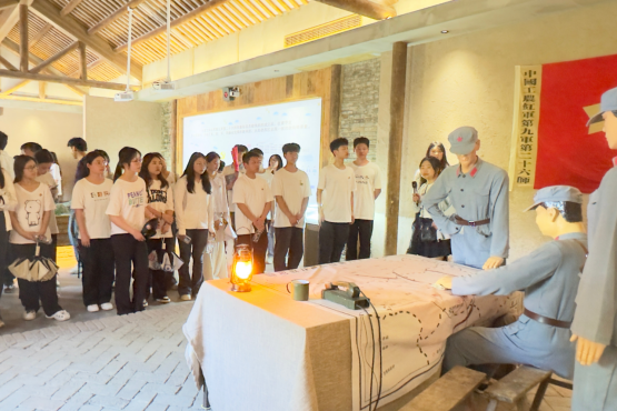 全体成员到达目的地后,在红九军26师“铸魂”碑前庄严宣誓,随后在解说员的带领下有序进入馆内参观体验。展馆木门打开的瞬间,仿若坐上时光机穿越回了1930那个动荡不安的战乱年代。