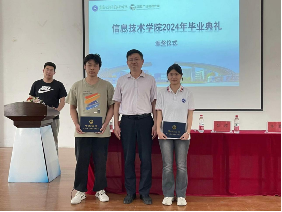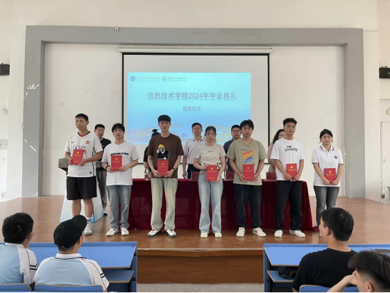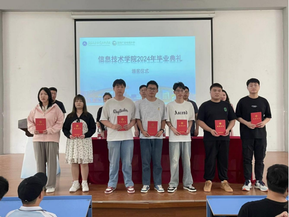 吴超宣读了“信息技术学院2024届优秀毕业生”、“信息技术学院2024届优秀实习生”的表彰文件。院领导为获表彰毕业生代表颁发荣誉证书,对他们的努力和付出表示了充分的肯定和赞扬。