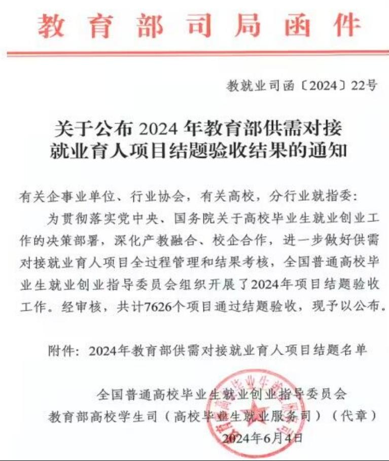 2024年6月4日,教育部就业司发布了《关于公布2024年教育部供需对接就业育人项目结题验收结果的通知》(教就业司函【2024】22号),汽车工程学院联合浙江吉利控股集团有限公司立项的3个项目顺利结题。