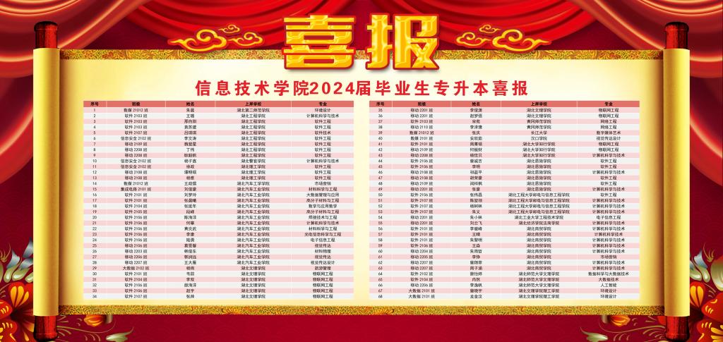 心中耕耘有矢志,硕果飘香又一年。近日,湖北省2024年普通高校专升本录取结果揭晓,我院学生成绩可喜、再创佳绩!今年信息技术学院共有260名学生报考了专升本考试,有141名学生分别被湖北工程学院、湖北第二师范学院、湖北理工学院、湖北汽车工业学院、湖北文理学院、湖北大学知行学院、湖北恩施学院、湖北工程大学邮电与信息工程学院、湖北商贸学院、湖北师范大学文理学院、湖北文理学院理工学院、荆州学院、武昌理工学院、武汉工商学院等省内31所本科院校录取,录取率达54%。
