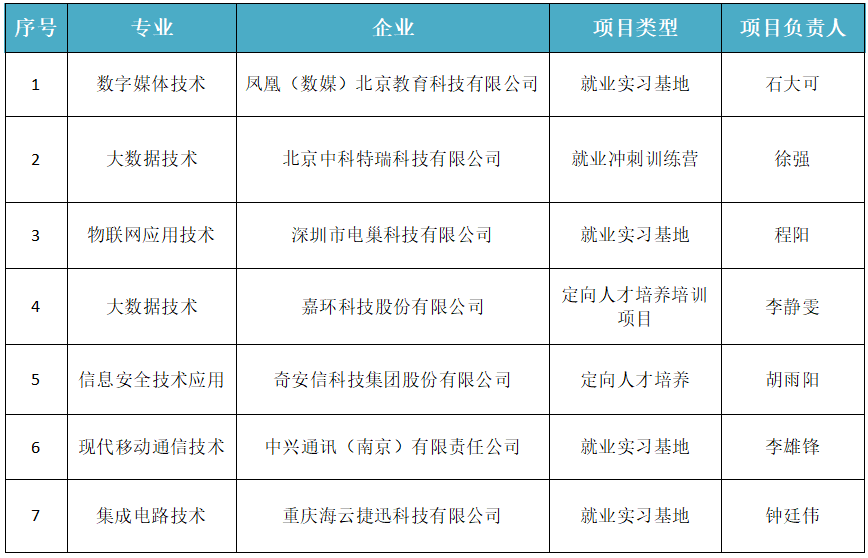 近日,教育部高校学生司印发《关于公布教育部第三期供需对接就业育人项目立项名单的通知》,经高校与用人单位联合申报、专家审核,确定了第三期供需对接就业育人项目名单。信息技术学院共有7个项目入选,项目类型涵盖就业实习基地、就业冲刺训练营、定向人才培养培训项目、定向人才培养等四大类。