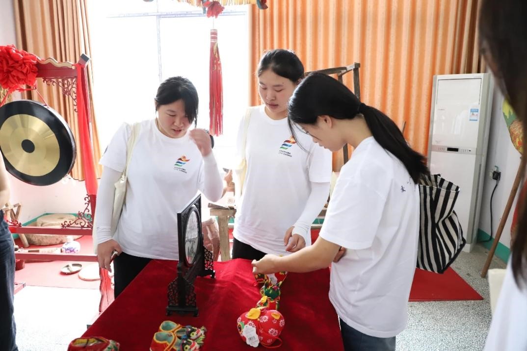 在工作人员的带领下,团队成员们一起参观了非遗展厅,馆内展出了各类非遗文化作品包括枣阳粗布、剪纸、刺绣等。