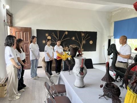 随后,团队成员参观了展览室。展览室内,陈列着各式各样精美的柳编工艺品,有实用的柳编家具、精致的柳编摆件,还有创意十足的柳编艺术品。在参观过程中,传承人朱德安通过一些成品柳编向同学们讲解了六种常见的柳编编法,详细耐心的解释了柳条从选材、泡条、编织到成型的过程;每一个环节都展现着编织者们的高超技艺和匠心独运,队员们目不转睛地注视着朱大师的双手交替变换,一挑一压,一勒一编,柳条随手上下翻飞,仿佛在欣赏一场精彩的艺术表演。这些作品不仅展现了柳编极高的艺术价值,同时在制作理念上与时俱进,将实用性融入到了传统工艺中,使柳编工艺在现代社会焕发生机。队员们参观后纷纷赞叹不已,时不时拿起作品仔细端详,感受着柳编所蕴含的独特韵味。