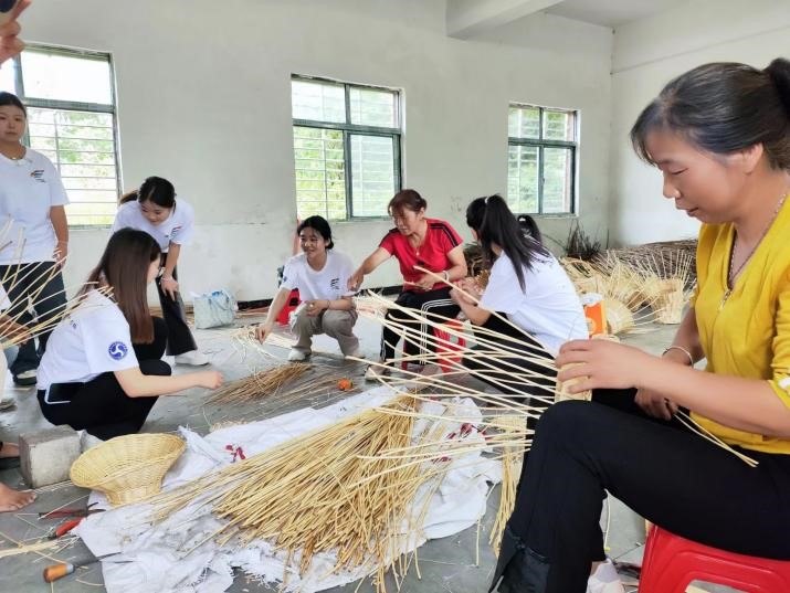 (图为队员们在学习编织花篮的过程)