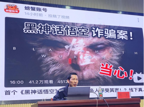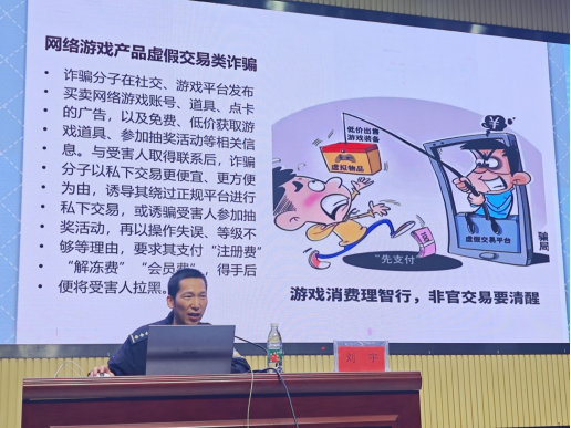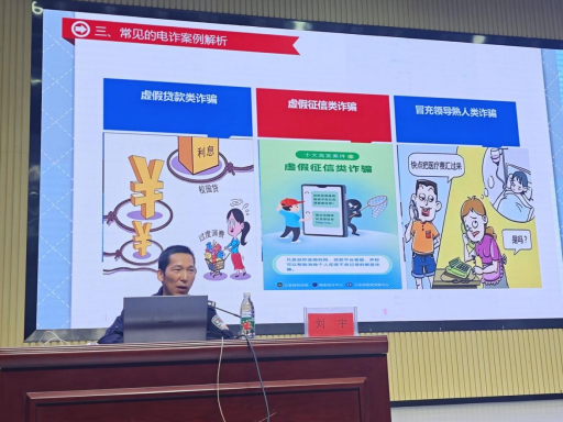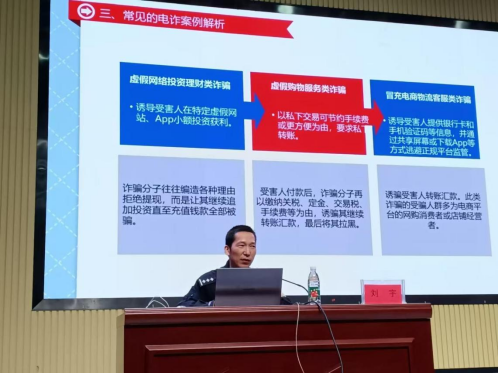 活动中,刘宇警官从“什么是电信诈骗”“电信诈骗的特点”“常见的诈骗手法”“如何应对骗局”等方面入手,详细讲述了电信网络诈骗的定义及特点,并以案说法,在授课的过程中教育引导学生识别诈骗情形,提高警惕,不轻易扫描二维码、点击陌生链接,不随便透露个人信息,不轻信虚假信息,不轻信陌生来电,不向不明账户转账,不给诈骗分子可乘之机。守护好自己的钱袋子,学会防患于未然。同时着重提醒学生们当前电信诈骗方式多种多样,手段层出不穷,要“增强法治观念”,自觉抵制和远离不法犯罪行为,不得不义之财、不做电诈帮凶。