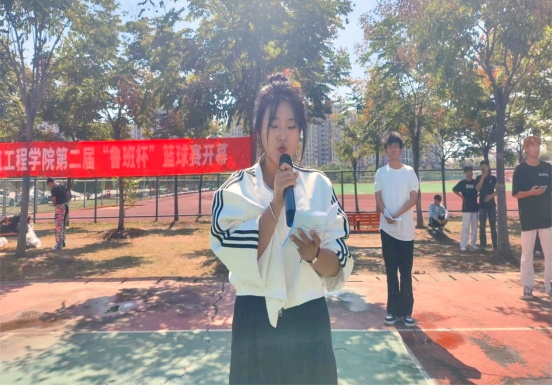 建筑工程学院何红霞院长致辞,她表示,发展体育运动、弘扬体育精神,对学校和社会的发展有着重要意义。最后她用铿锵有力的话语表达了对本次篮球赛的热烈祝贺和美好期望。