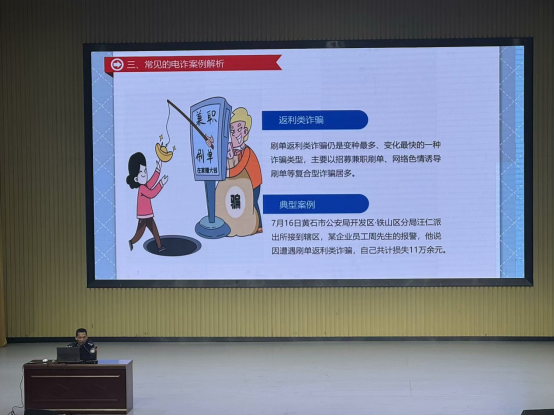 刘警官以大量真实案例和详实的数据,向同学们介绍了刷单返利兼职、冒充网购客服、冒充熟人、冒充贷款客服、虚假投资理财平台、“校园贷”诈骗等常见电信诈骗方式,又从常见的网络贷款诈骗、冒充公检法诈骗,延伸到新型的交友诈骗等。深入剖析了诈骗分子的作案手法,揭穿了骗子常用的诈骗伎俩,并提出了有针对性的应对防范措施,叮嘱同学们要牢固树立反诈骗意识,切忌贪小便宜,切实维护好自身的人身财产安全。
